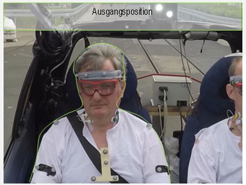 Durch die Auswertung eines Crashversuchs mit einem biofidelen Dummy konnte gezeigt werden, dass es bei einer Heckkollision in der Reboundphase zum Kopfanprall des Insassen gegen den Fahrzeugdachhimmel bei einer normalen Sitzposition und bei normaler Körpergröße kommen kann. Mit spezieller Messtechnik ist es zudem möglich, die Druckbelastung für das Ohr durch das Kollisionsgeräusch und den Knall bei der Airbagauslösung individuell zu messen.